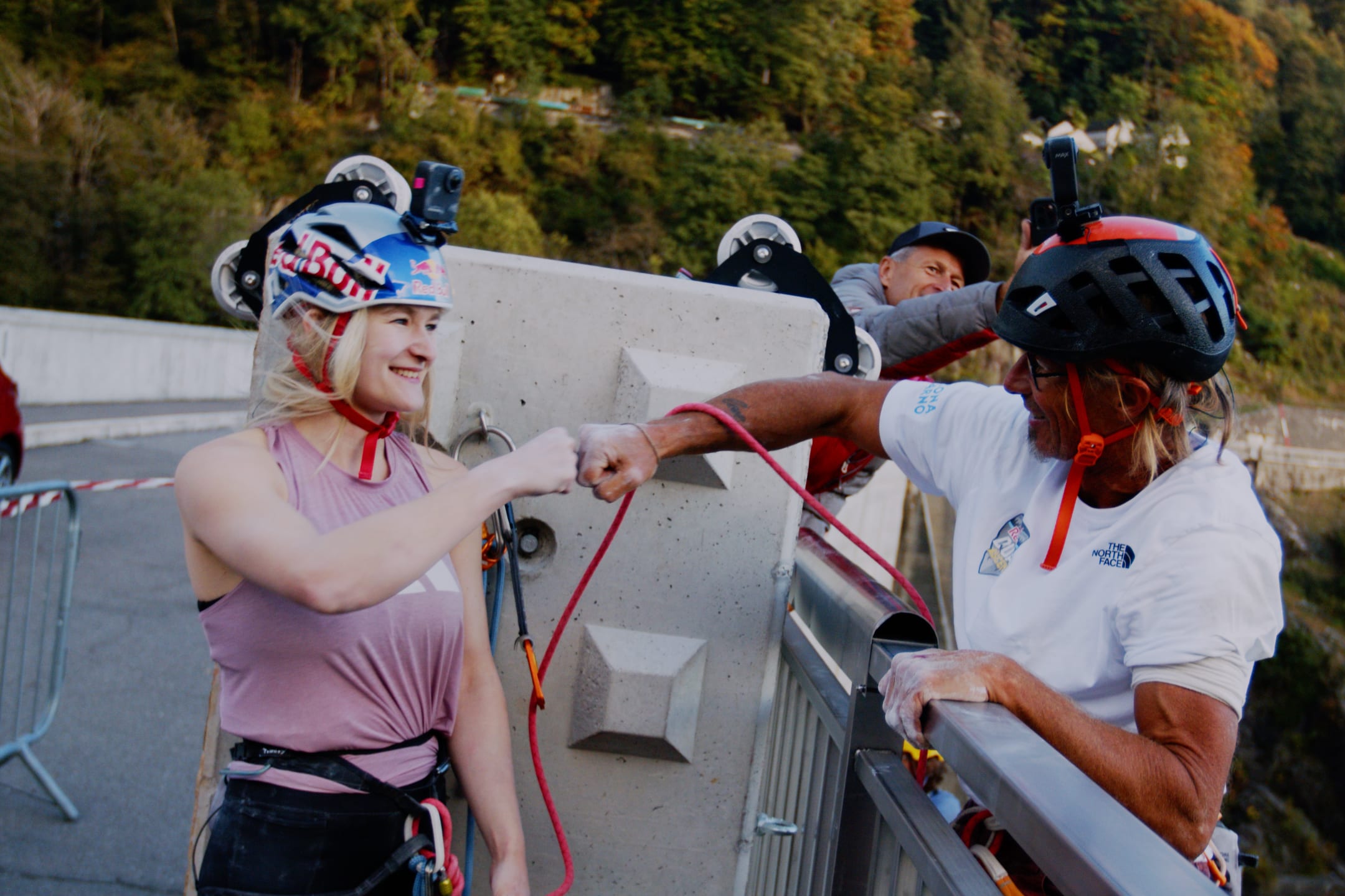 «Tenía tantas ganas de escalar que ni siquiera pensé en tener miedo», comentaba Coxsey. La experiencia y la habilidad de su compañero de escalada Wüthrich, que vivió con su familia en Ticino de 1998 a 2012 y abrió unas 1.000 vías diferentes en la meca de la escalada, sin duda contribuyó a ello. Tomó la delantera en el primer largo de 25 metros, descansando antes de cada punto de seguridad. No se movían tan rápido como habían planeado, pero sí de manera constante: las dos diminutas figuras se acercaban cada vez más a la parte superior de la presa. Puro espectáculo.